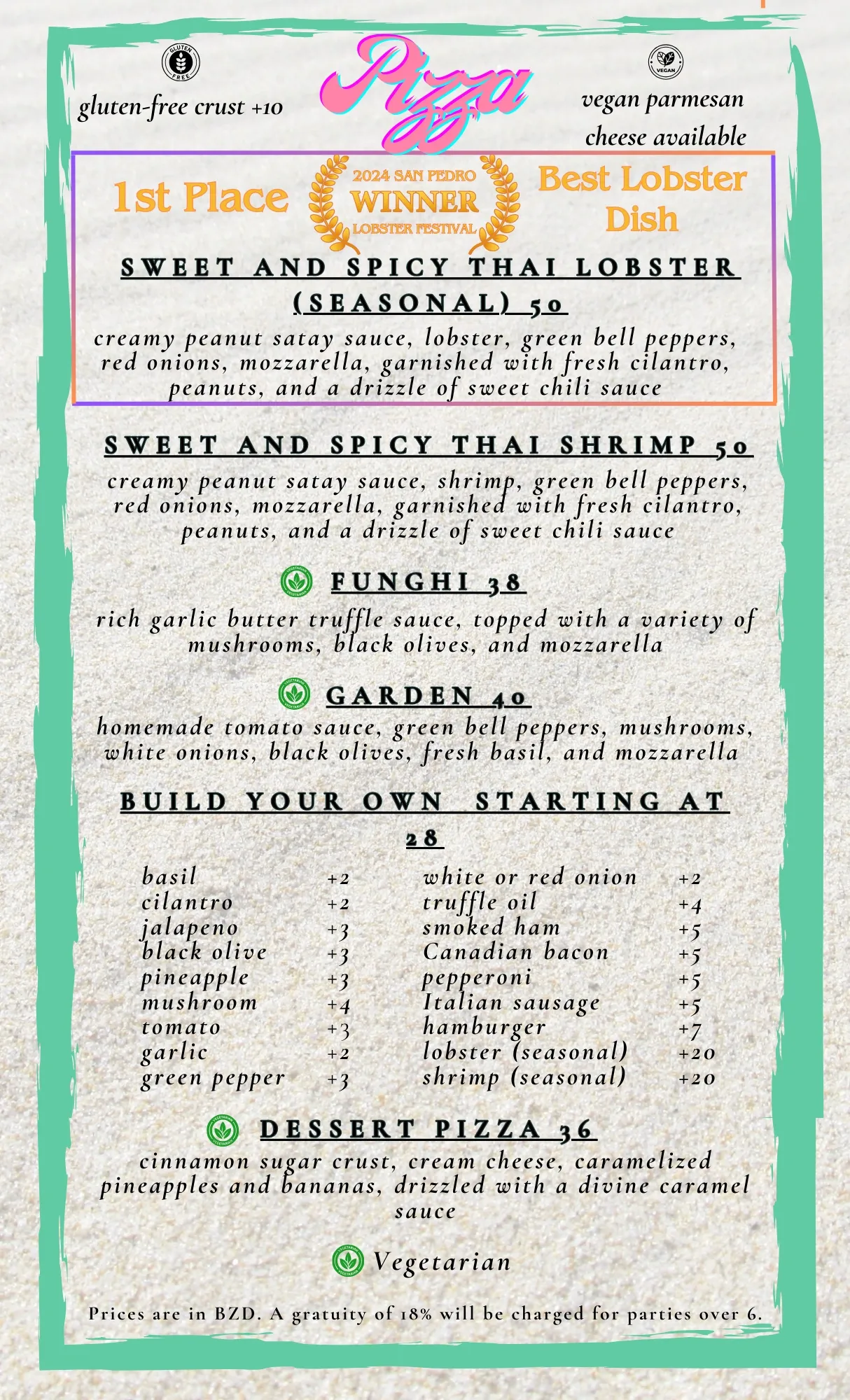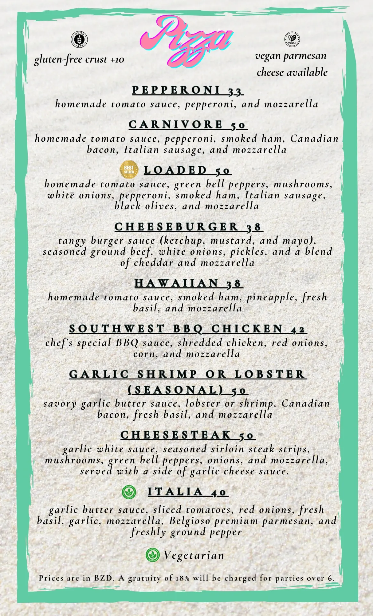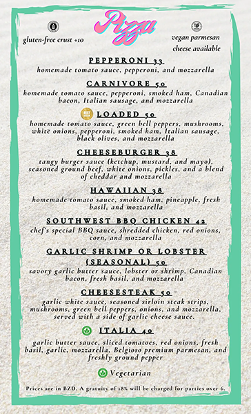 Have dietary preferences? We've got you covered with our delicious gluten-free crust and house-made vegan cashew parmesan. With so many pizzas to choose from, you may find yourself coming back again and again - and we'll be ready with a chilled drink and the Caribbean breeze waiting just for you.