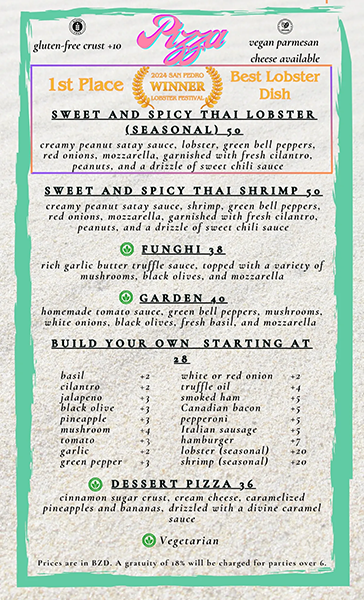 Moon Bar offers something for every craving - from creamy white pizzas and bright, flavorful vegetarian combinations, to our wildly popular Loaded Pizza piled high with bold, mouthwatering toppings. And if you're in the mood for something truly extraordinary, our Sweet & Spicy Thai Lobster Pizza - crowned Best Lobster Dish at the 2024 San Pedro Lobsterfest - is an experience all its own.